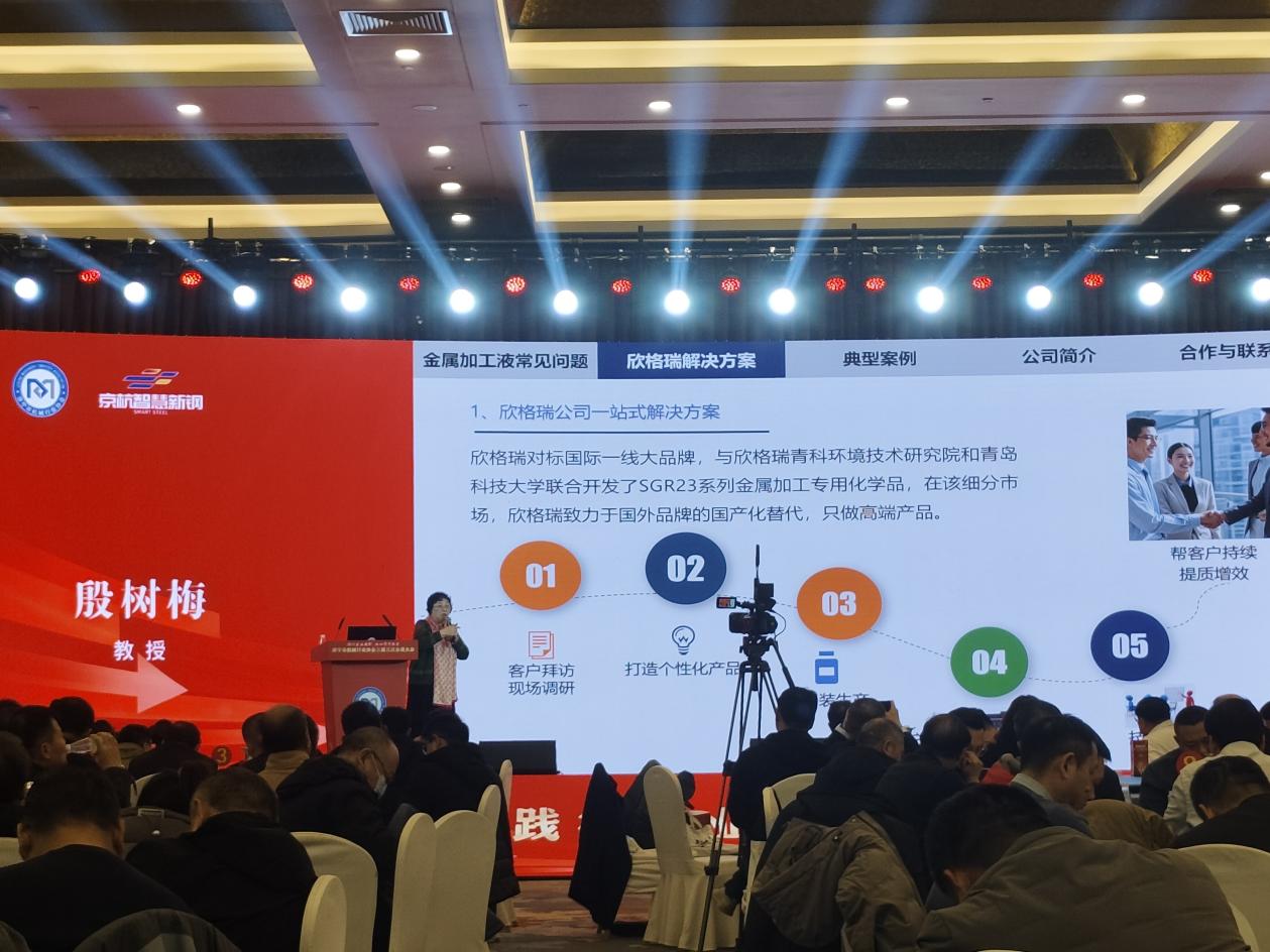 作為本次大會(huì)協(xié)辦單位,欣格瑞公司高級(jí)顧問殷樹梅應(yīng)邀對(duì)欣格瑞金屬加工液一站式解決方案進(jìn)行重點(diǎn)推介,她首先剖析了金屬加工液選擇不當(dāng)?shù)某R妴栴}及其根源,并據(jù)此推出欣格瑞全方位解決方案,該方案對(duì)標(biāo)國際一線品牌,由欣格瑞青科環(huán)境技術(shù)研究院與青島科技大學(xué)聯(lián)合研發(fā)推出,能極大地在機(jī)械加工過程中提質(zhì)增效。在細(xì)分市場(chǎng)中,欣格瑞矢志不渝地推進(jìn)國外品牌的國產(chǎn)化替代,專注于高端產(chǎn)品的打造。公司產(chǎn)品體系完備,囊括了全合成切削液、半合成切削液、微乳化切削液,以及清洗劑、防銹劑、鈍化劑等配套產(chǎn)品,能夠充分滿足黑色金屬、有色金屬在車、磨、銑、鏜、鉆等工藝環(huán)節(jié)中的嚴(yán)格要求,以及后續(xù)工件的防銹、清洗、鈍化處理需求,在多個(gè)典型案例中展現(xiàn)出卓越的性能。同時(shí),公司具備強(qiáng)大的自主研發(fā)創(chuàng)新能力,目前已有兩項(xiàng)金屬加工液發(fā)明專利進(jìn)入實(shí)審階段。與會(huì)人員對(duì)欣格瑞公司金屬加工液一站式解決方案表示了濃厚的興趣,部分企業(yè)負(fù)責(zé)人就下步合作事宜展開深入交流。